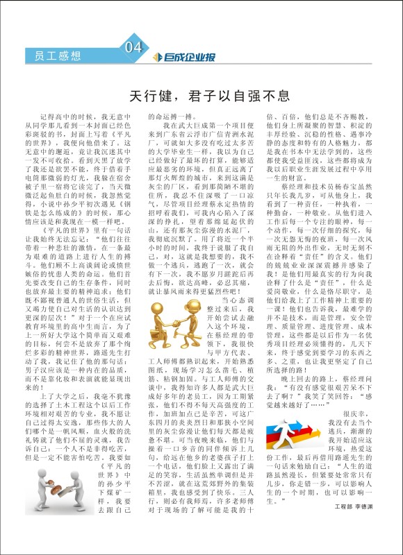 蔡经理和技术员杨宝春虽然只年长我几岁,可从他身上,我看到了一种责任,一种执着,一种勤奋,一种敬业。从他们进入工作后每一个专注的眼神,每一个动作,每一次仔细的探究,每一次无怨无悔的夜班,每一次风雨无阻的外出作业,无时无刻不在诠释着“责任”的含义。他们的兢兢业业深深震撼并感染了我!是他们用最真实的行为向我诠释了什么是“责任”,什么是爱岗敬业,什么是各尽职守,是他们给我上了工作精神上重要的一课!他们也告诉我,最难学的并不是技术,而是管理,安全管理、质量管理、进度管理、成本管理,这些都是以后作为一名优秀项目经理必须懂得的,几天下来,终于感觉到要学习的东西之多、之重,也让我更坚定了自己所选择的路!
