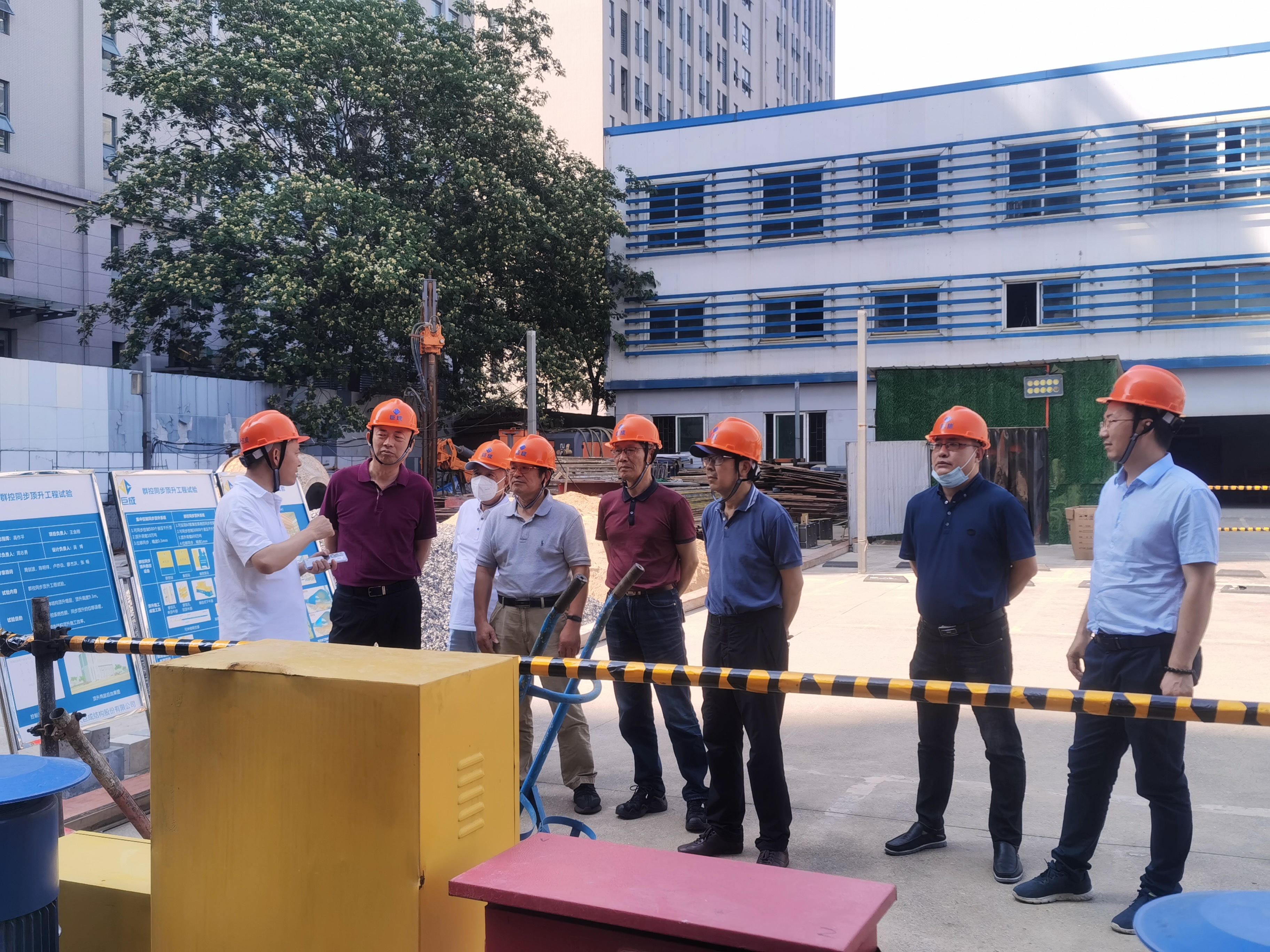考察团一行来到亚星官网群控同步顶升工程试验项目现场,亚星官网研究院院长助理周志勇介绍了顶升试验的背景、目的和群控同步顶升大型数控设备以及顶升应用前景。双方对钢滑道顶升技术和应用场景展开了深入的讨论和交流,大家一致认为亚星官网群控同步顶升技术能够在城市更新、老旧小区改造、滨海建筑物等领域发挥重大作用。