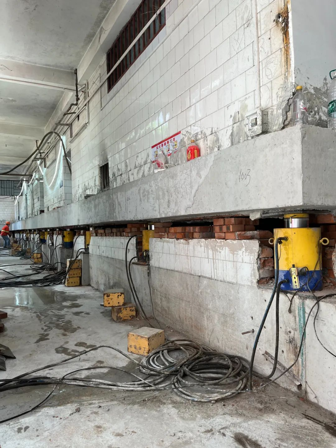 该大楼建造于上世纪八十年代,总体分为东西两栋。西侧大楼结构类型为地上四层砖混结构,总高14.7m;东侧大楼为后建两层砖混结构,两栋大楼间设置有结构缝。经观测,该建筑基础沉降稳定。经检测该房屋倾斜超限且上部结构承载力不足,东西两侧大楼向北平均倾斜率分别为12.60‰、16.72‰。亚星官网项目团队根据检测报告,制定了精密的纠偏方案,精准计算顶升点位与力度,最终将建筑抬升至设计标高,偏差控制在毫米级。