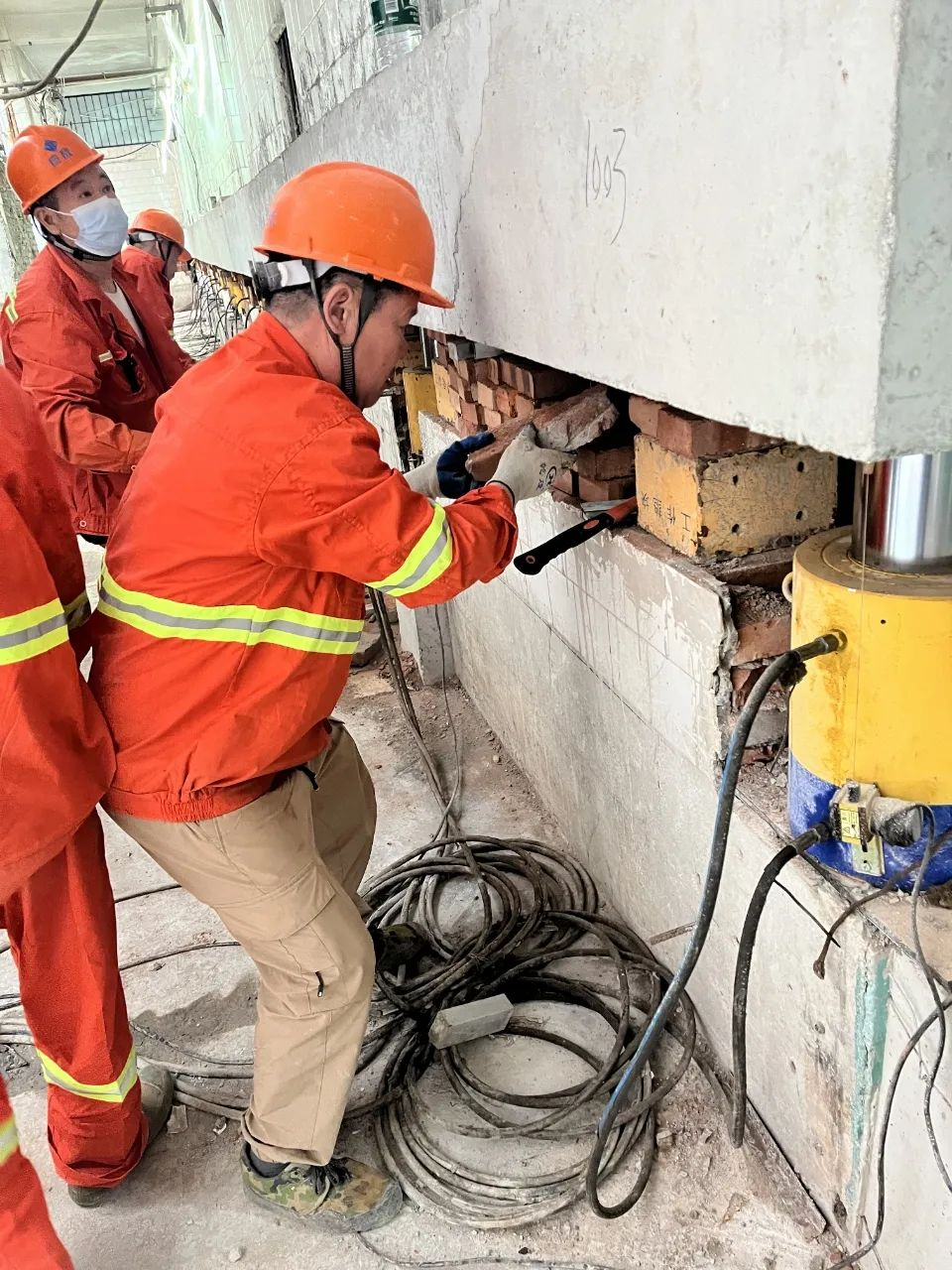 (2) 顶升过程中,专人负责观察墙体是否有开裂等异常情况,安全人员仔细观察两栋大楼结构缝处的间距,防止间隙过小。