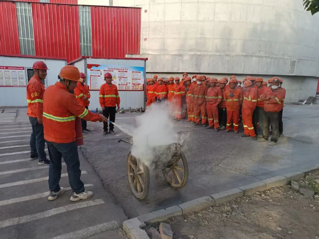 新疆伊犁项目现场:模拟氧乙炔切割作业突发火情场景,火情警报拉响后,应急小组迅速响应,应急小组 30 秒启动灭火器,3 分钟完成消防栓联动,5分钟控制火势并有序疏散100余名作业人员;